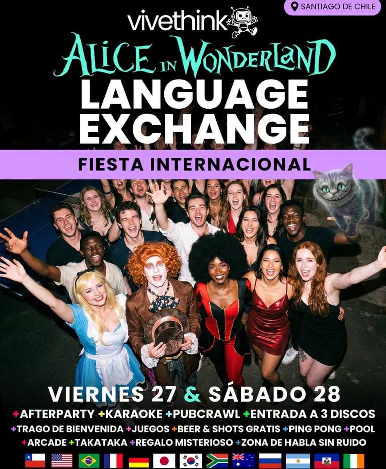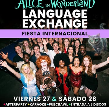Este es el cronograma para el Viernes 27 y Sábado 28 de Febrero 🌎 Intercambio de idiomas • Fiesta Internacional ✨Alice in Wonderland🎩: